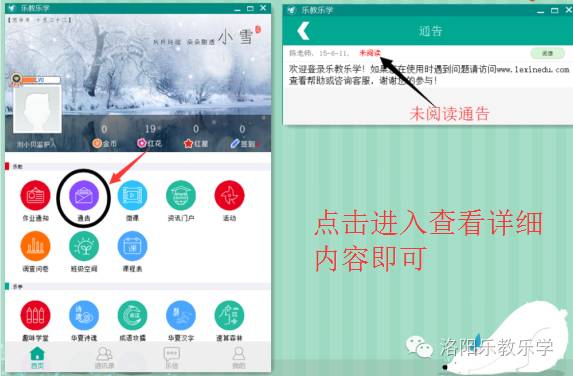 操作步骤:点击“通告”——点击未阅读的通告,查看具体内容即可。